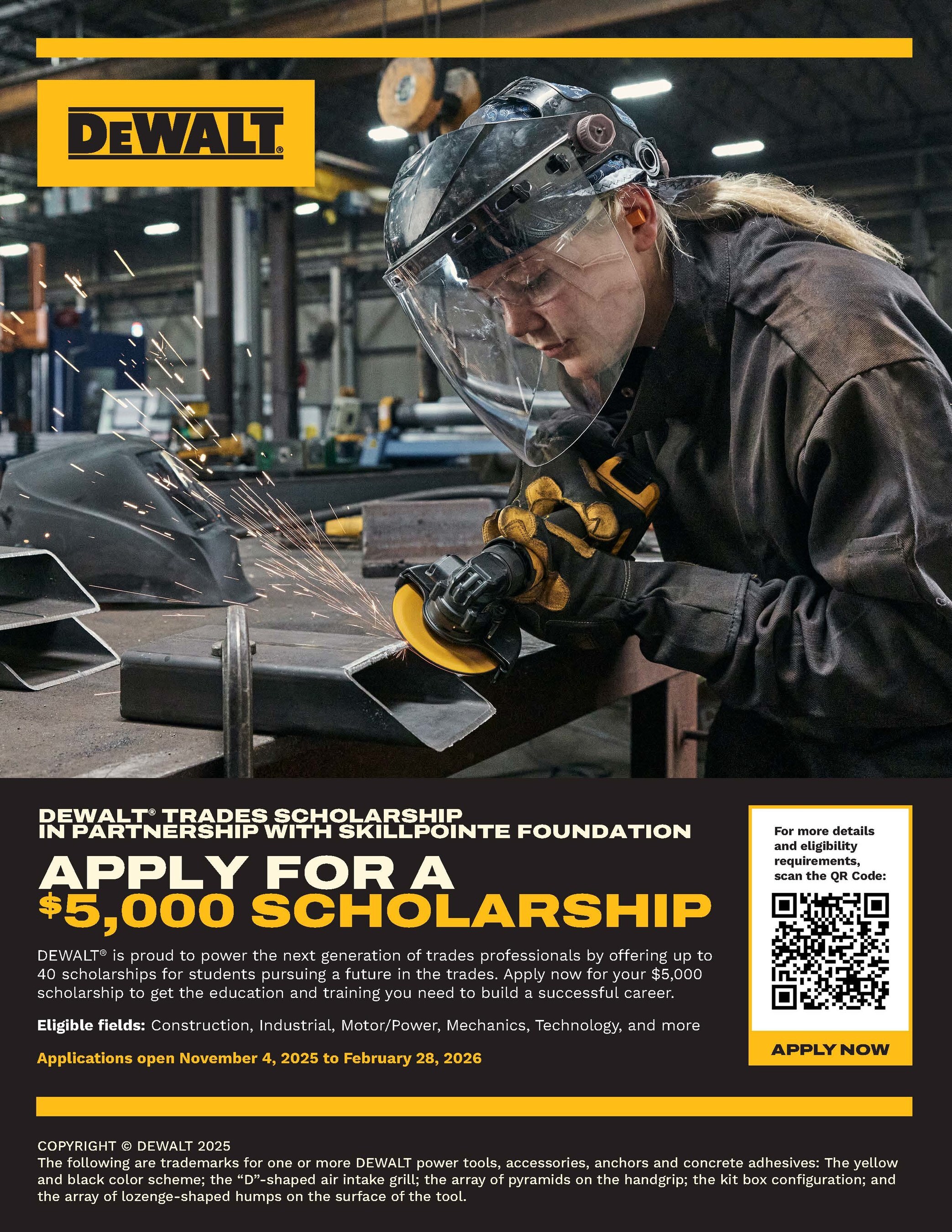 Applications for the DEWALT Trades Scholarship are open now through February 28, 2026.
