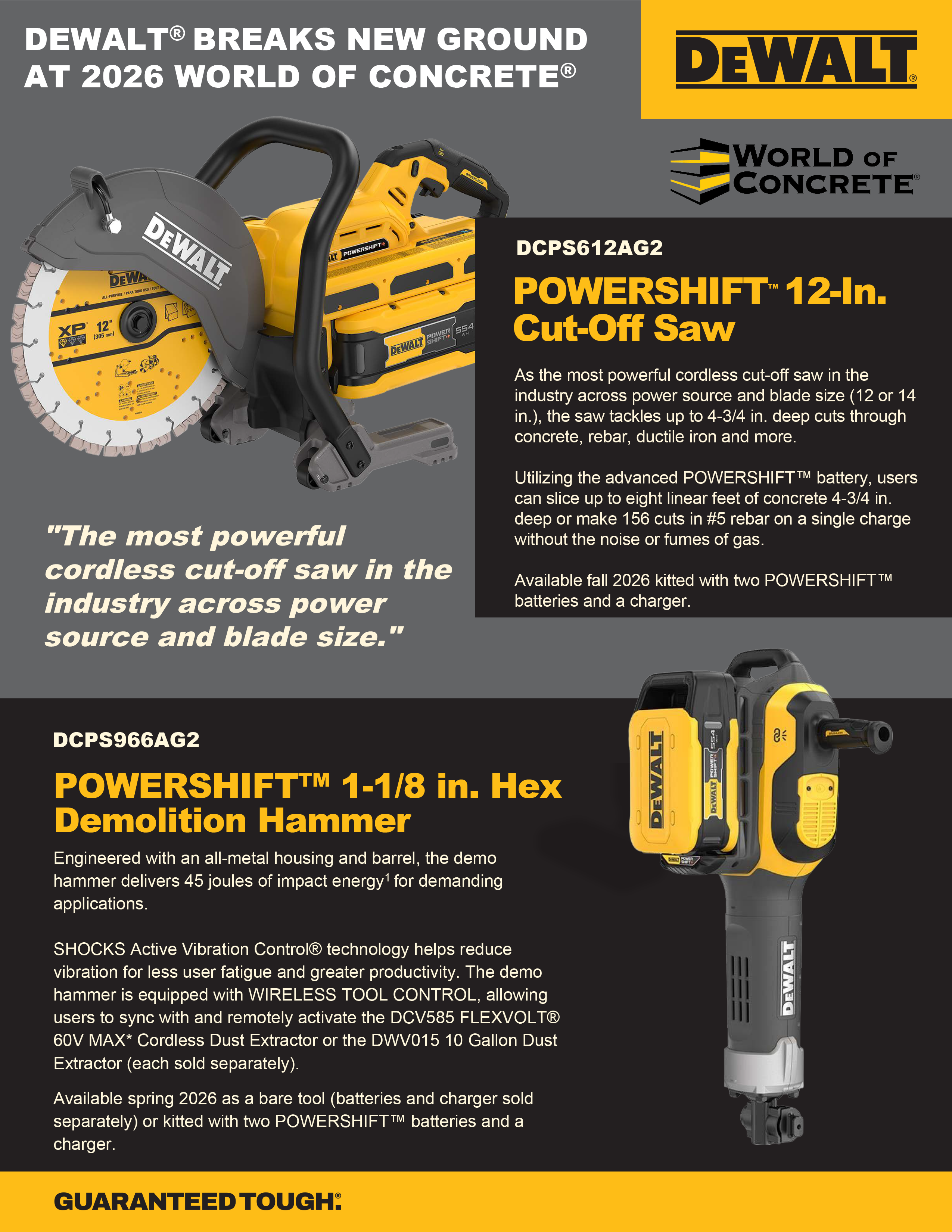 TOWSON, Md., January 13, 2026 – DEWALT, a Stanley Black & Decker (NYSE: SWK) brand and relentless innovator for jobsite professionals, will debut new comprehensive concrete solutions at the 2026 World of Concrete® Trade Show in Las Vegas from January 20-22. Among this year’s highlights, two new cutting-edge innovations will join the acclaimed DEWALT POWERSHIFT™ line, including the standout POWERSHIFT™ 12 in. Cut-Off Saw (DCPS612AG2) and the 1-1/8 in. Hex Demolition Hammer (DCPS966AG2), both delivering unmatched performance.