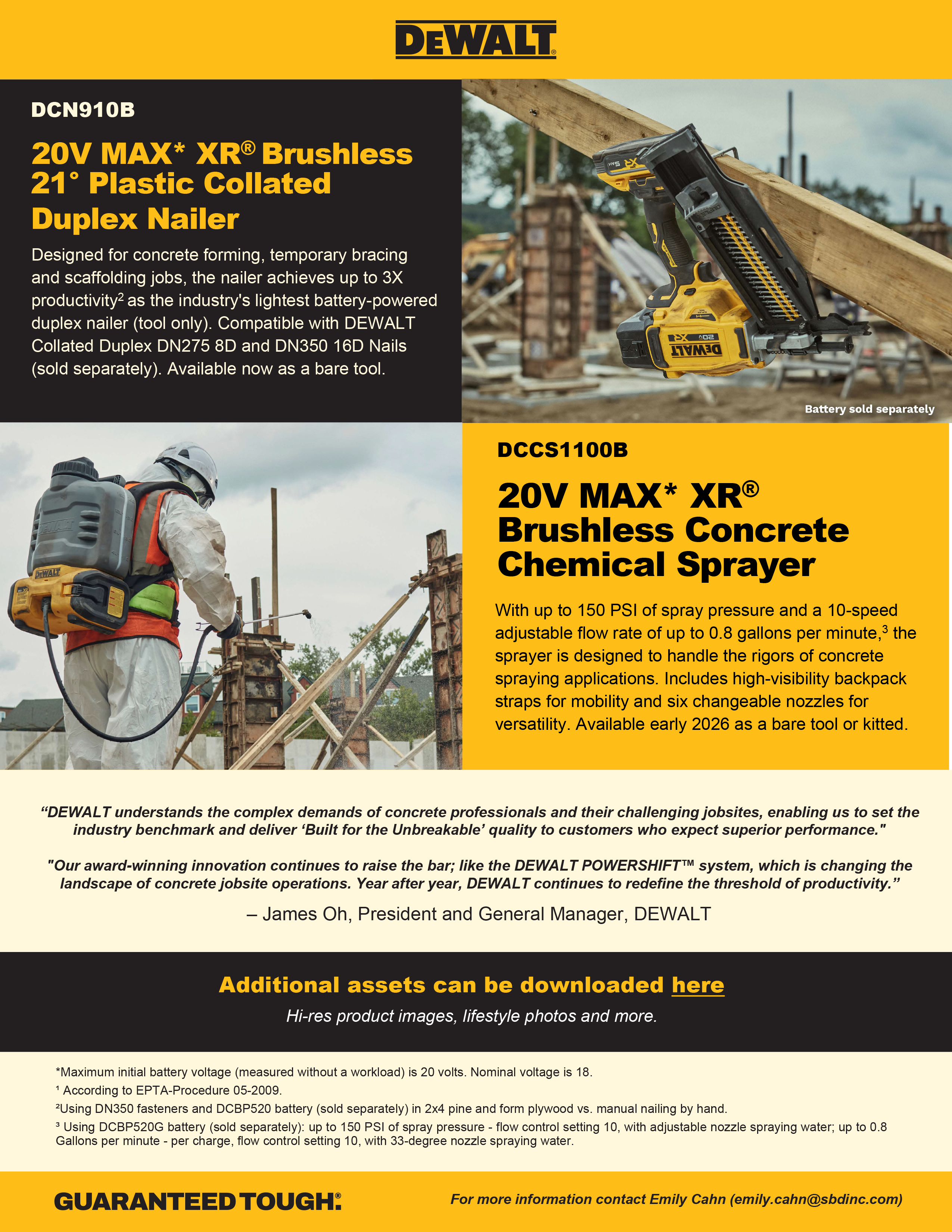 DEWALT 20V MAX* XR® Brushless Concrete Chemical Sprayer (DCCS1100B): With up to 150 PSI of spray pressure and a 10-speed adjustable flow rate of up to 0.8 gallons per minute,³ the sprayer is designed to handle the rigors of concrete spraying applications. Includes high-visibility backpack straps for mobility and six changeable nozzles for versatility. Available early 2026 as a bare tool (battery and charger sold separately) or kitted with a battery and charger.